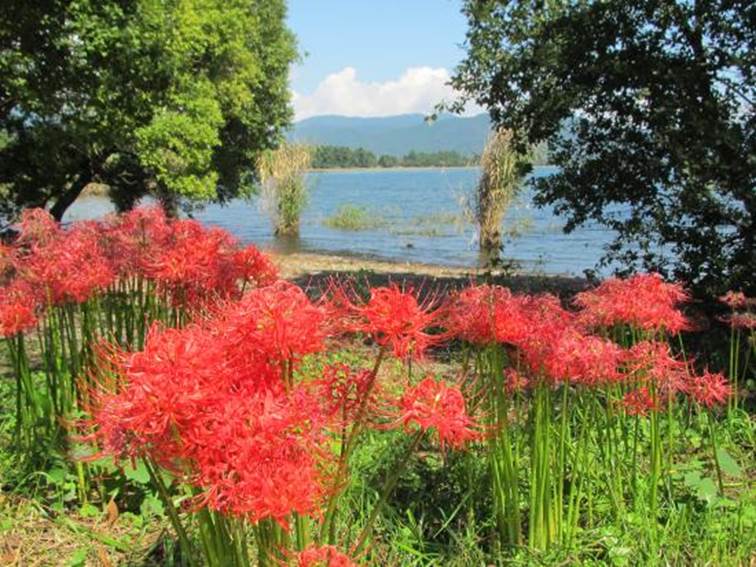午後は松原の湖岸を南へ歩き、桂浜園地のヒガンバナを堪能し、今津浜まで6`の游歩を楽しんできました。